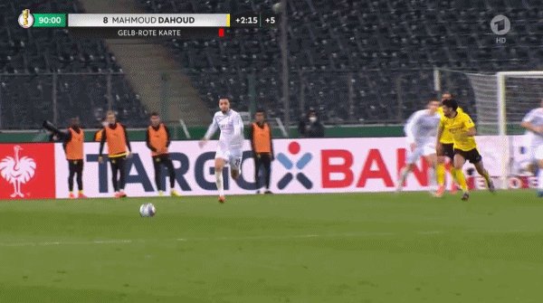 90+3'达胡德对本·塞拜尼犯规,领到第二张黄牌被罚下,多特以10人应战